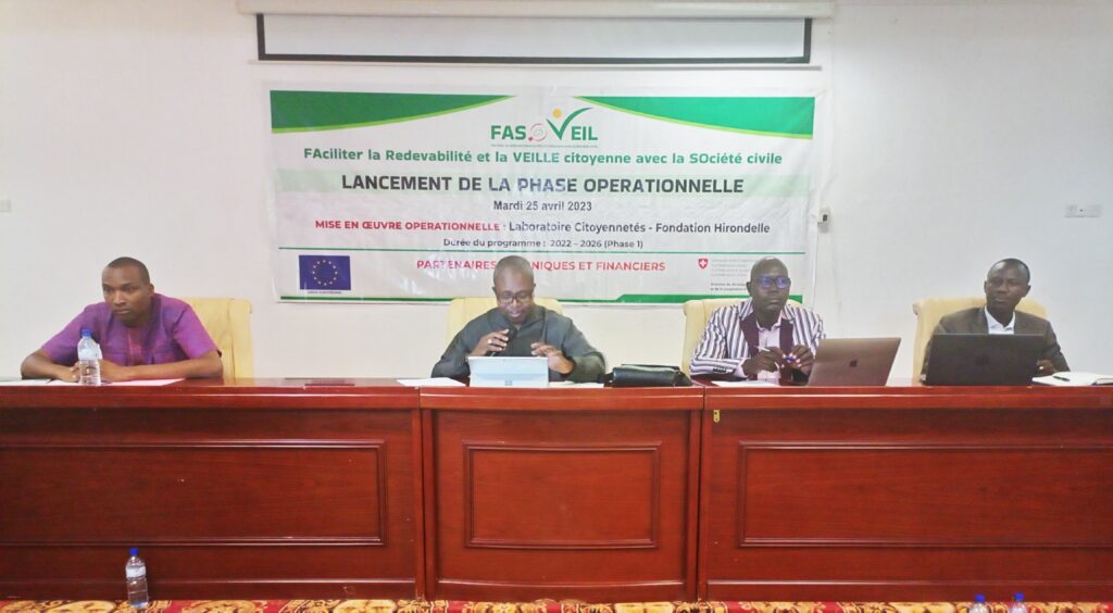 La phase opérationnelle du projet FAciliter la Redevabilité et la VEILLE citoyenne avec la SOciété civile (FasoVeil) est officiellement lancée. C’était ce 25 avril 2023 à Ouagadougou. Le projet est piloté par la Fondation Hirondelle et le Laboratoire Citoyennetés. L’objectif est de favoriser la construction d’un dialogue ouvert, critique et efficace entre l’État et la société civile.
