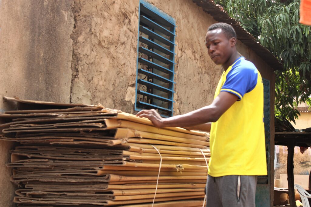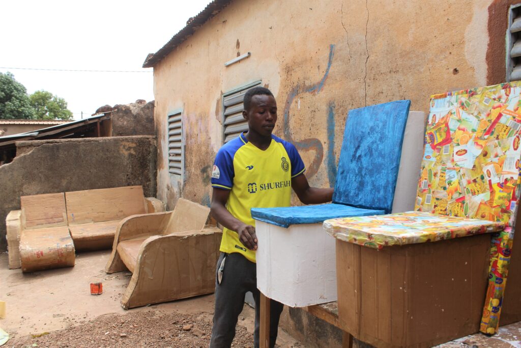 Sylvain Zongo, 22 ans, vient de finir la composition de son baccalauréat session 2023. Pour se changer l’esprit et oublier la pression de l’attente des résultats, il nous conduit dans son domicile dans un quartier de Koudougou. Là se trouve également son atelier de fabrication de mobiliers en carton. Les cartons, il les avait préalablement achetés chez des vendeurs d’objets électroniques.