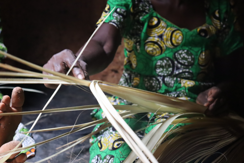 Assise à l’écart, la probable future confectionneuse de paniers ne quitte pas du regard les doigts des femmes qui manipulent presque automatiquement les feuilles de rônier.
