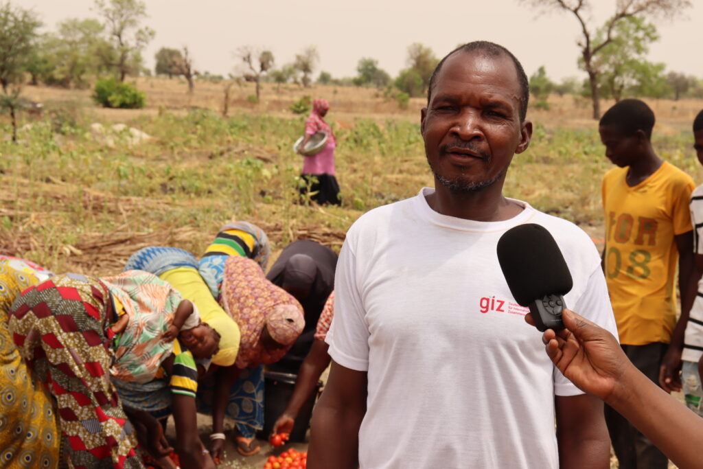 Sous un soleil ardent, Nonsymaba Ouédraogo, le pas agile, passe d’un jardin à un autre. Il se retourne fréquemment pour demander à ses invitées de faire attention aux puits asséchés qui viennent d’être recouverts de terre. Nous sommes en plein mois d’avril, mais sur ce vaste périmètre, des femmes viennent de récolter de la tomate et les hommes tout en sueur, remuent la terre nouvellement arrosée. « D’ici jusque là-bas, ce sont des déplacés internes. Ils sont sur plusieurs sites ici à Bagré », explique Nonsymaba.