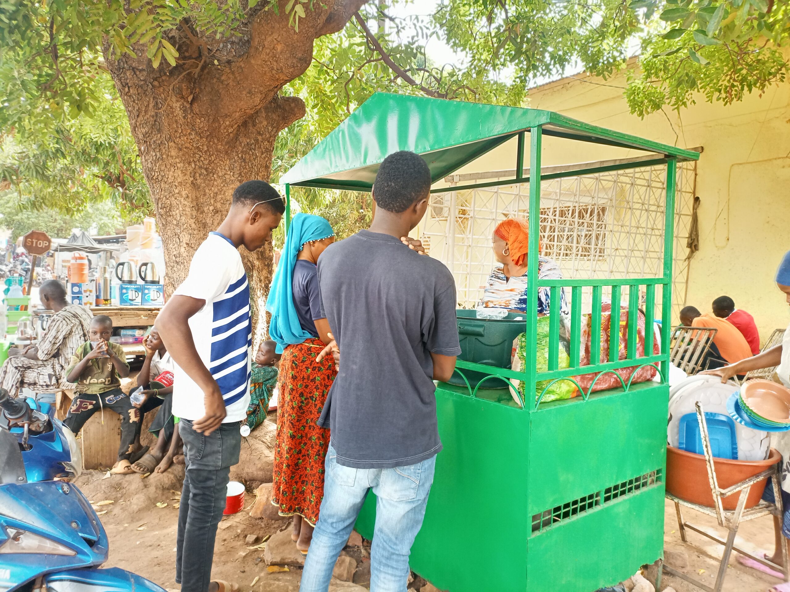 Bien que situé à proximité du grand marché de Bobo-Dioulasso, le monde regroupé autour du commerce de Adjara Sanou n’est pas uniquement lié à ce haut lieu de l’économie de la deuxième capitale du pays. Des commerçants, leurs clients, des passants, constituent les petits gourmets de la vendeuse de faro au pain.