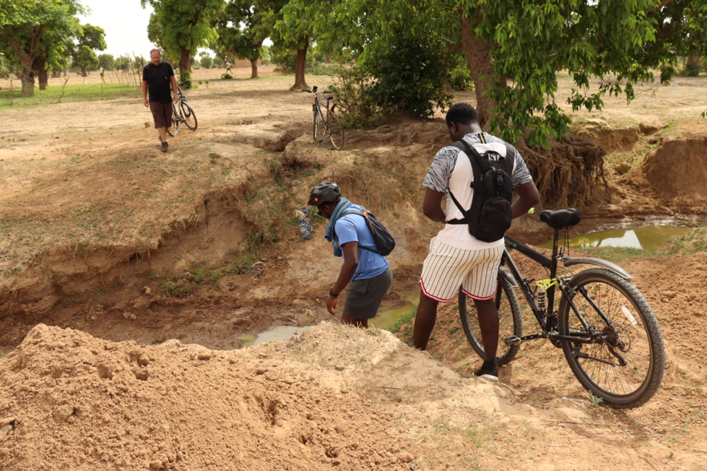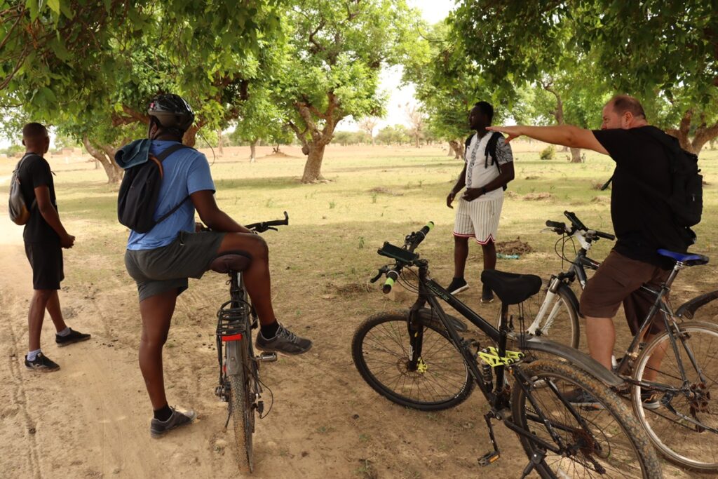 Le chemin serpente des concessions étroites avant de déboucher sur une forêt clairsemée. En file indienne, chacun pédale à son rythme sur une piste tantôt lisse, tantôt rocailleuse, faisant souvent rebondir nos VTT. Jusqu’à 8 km plus loin, tout se passe bien. Puis, Ismaël marque un arrêt brutal : son pneu a crevé. Cela gâche un peu le plaisir du groupe. Ismaël rebrousse chemin à la recherche d’un mécanicien. Pendant ce temps, les autres continuent leur randonnée. Rien ne pouvait arrêter ces cinq randonneurs. Pas même un pneu récalcitrant.