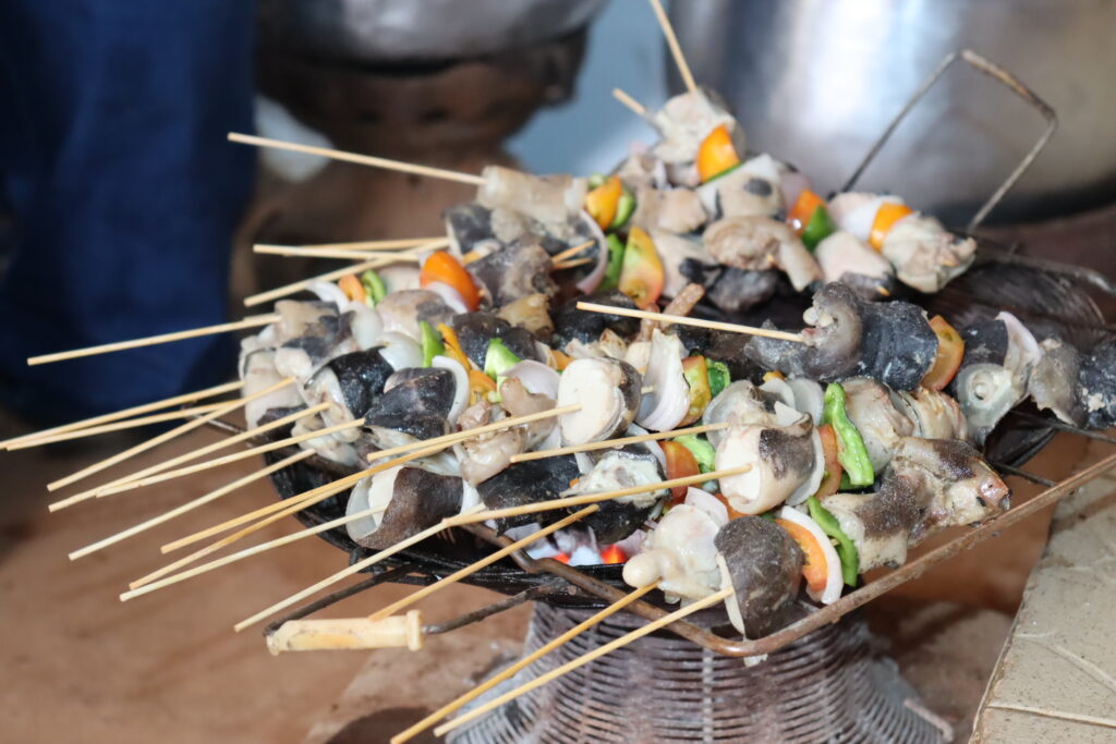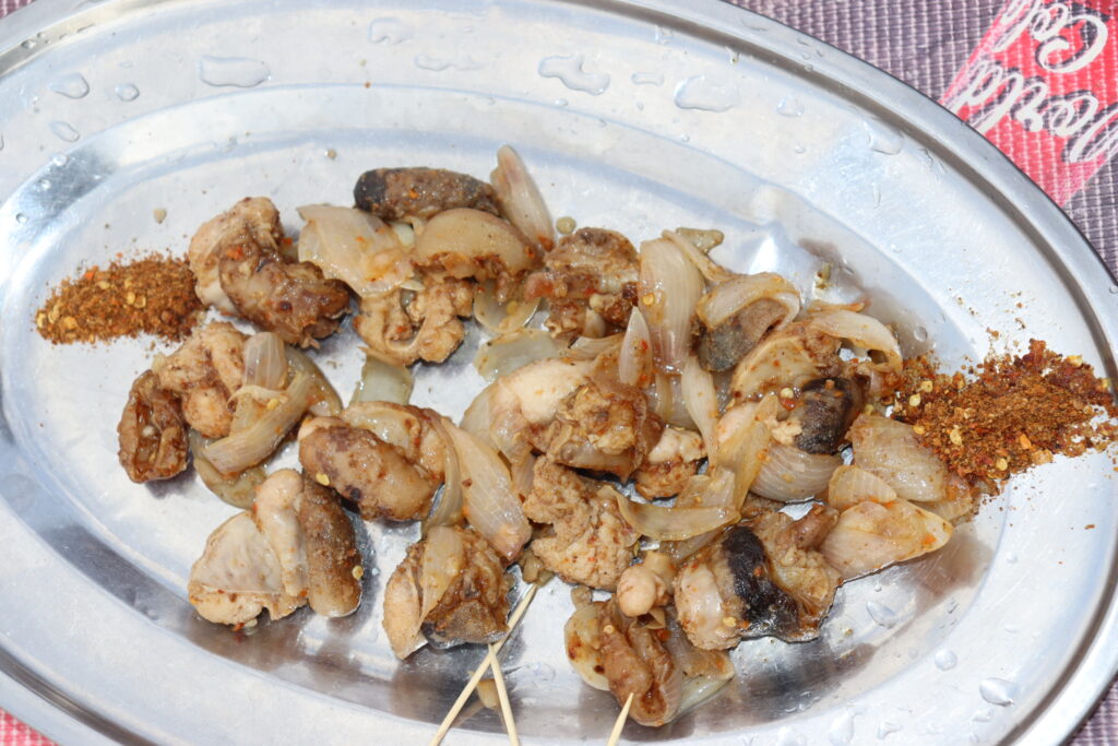 « Il y a des gens qui lancent la commande à l’avance, deux à trois semaines avant. Quand ça vient, je n’arrive pas à publier. Dès que tu publies et que les gens demandent et tu dis que c’est fini, certains s’énervent même. Par exemple pour aujourd’hui là, c’est une liste d’attente. Ce n’est pas un plat qui reste. Quand ça vient seulement, c’est parti », poursuit Aziza tout en badigeonnant les brochettes d’huile mélangée d’épices. Il faut faire vite. Il est presque midi et des client.es attendent impatiemment de déguster des testicules.