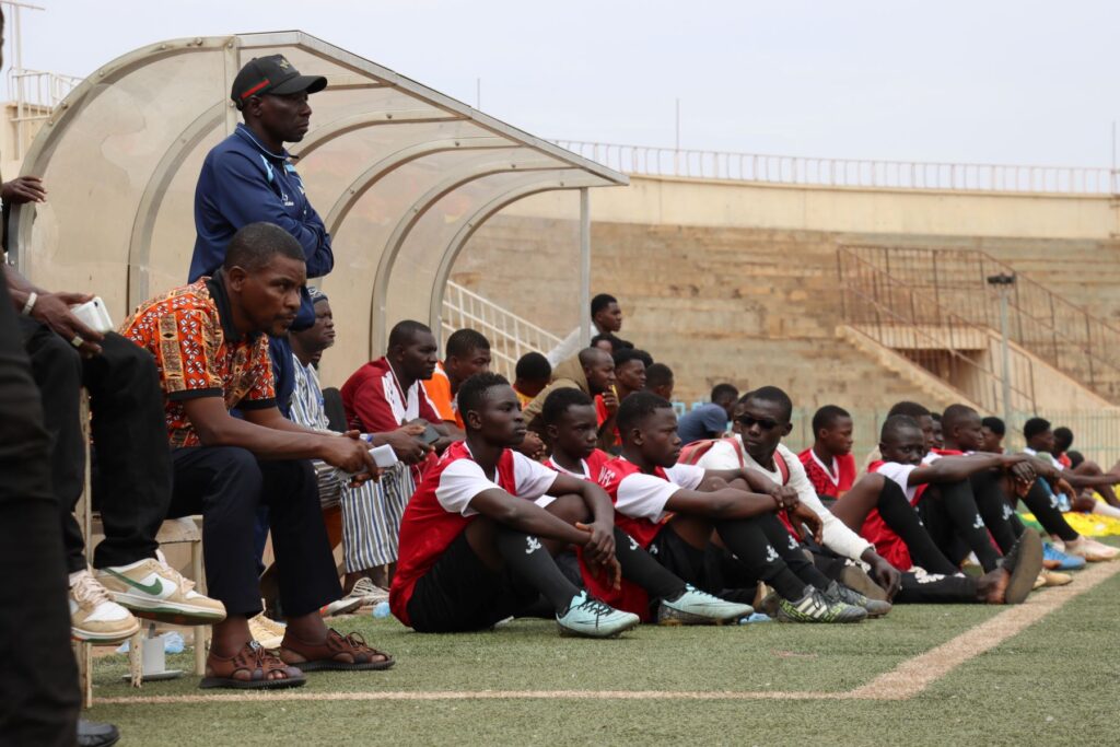 Des entraîneurs et des joueurs regardant un match de football au Stade Municipal de Ouagadougou. Photo: Studio Yafa.