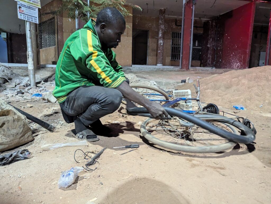 Âgé d’une trentaine d’années, Lamine exerce également d’autres activités dans la journée. Mais dès que la nuit tombe, il installe son matériel à Dassasgo, un autre quartier de Ouaga, convaincu que les clients viendront. « Les tarifs de nuit ne sont pas les mêmes qu’en journée. Par exemple, la nuit, on colle un pneu à 200 francs CFA, que ce soit une moto ou un vélo. Nous, on répare tout à ce prix-là ».