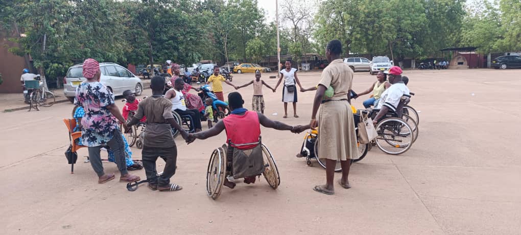 L’heure est au sport au centre national des personnes handicapées moteurs du Burkina, à Gounghin, un quartier de Ouagadougou. Dans des fauteuils roulants, avec des béquilles… des personnes vivant avec un handicap se retrouvent les mardis et jeudis pour une séance de sport. Ce jour d’avril, formant un grand cercle, ils sont une dizaine à se lancer un ballon à tour de rôle.