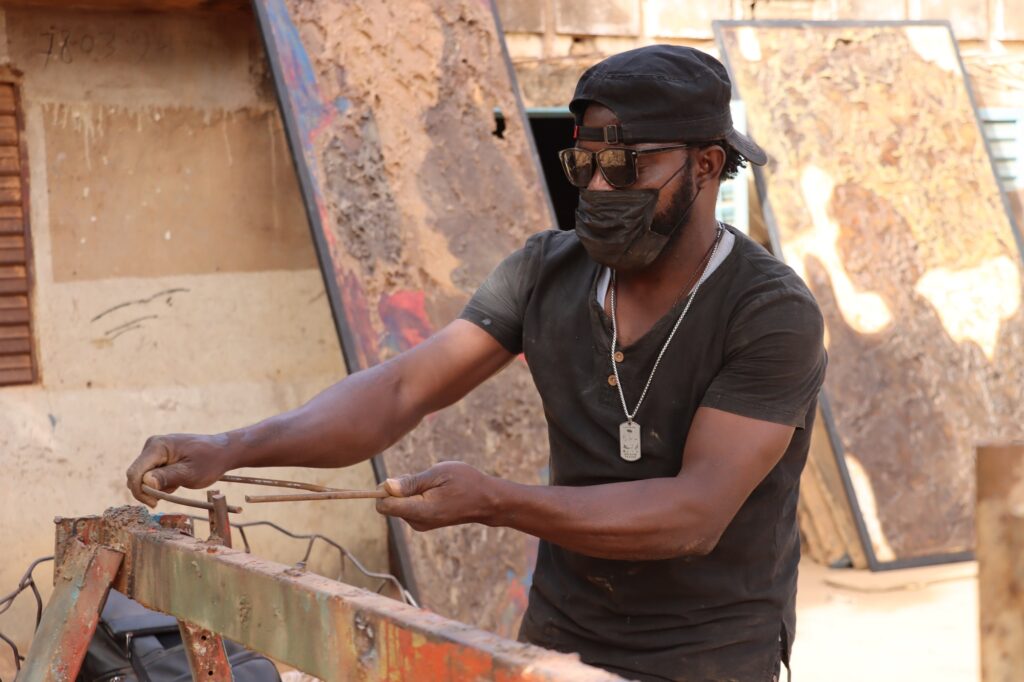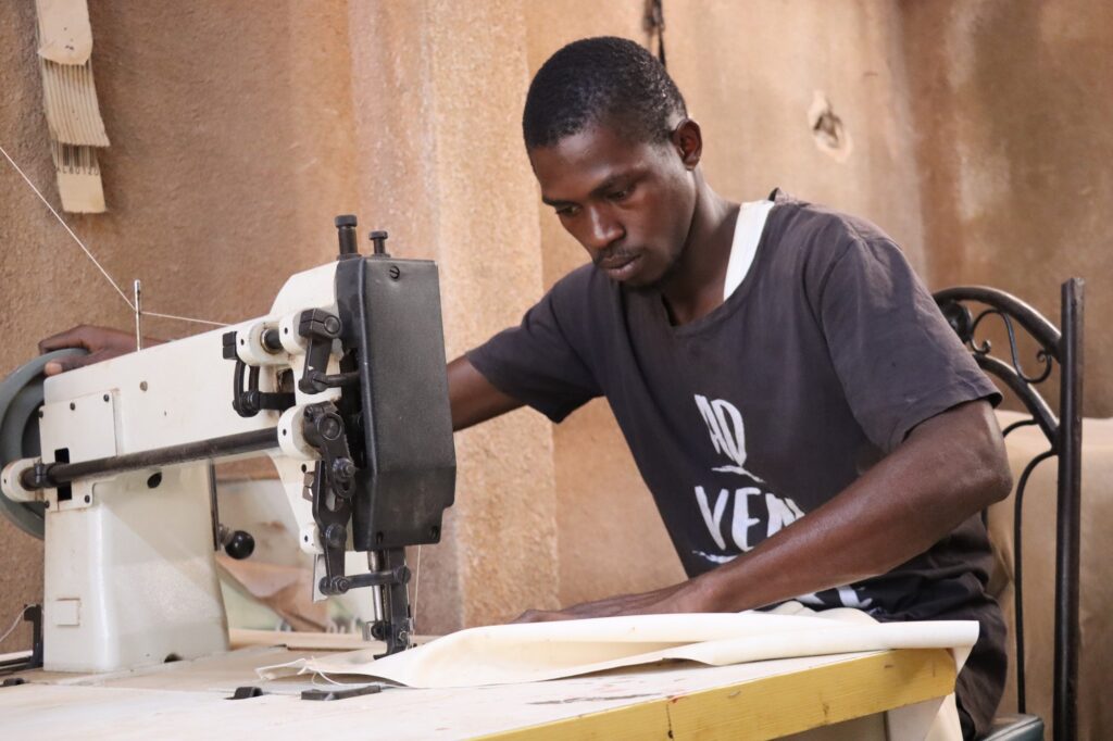 Pour le prouver, il nous conduit dans son atelier, dans une cour voisine. Les bruits du rabot et de la scie résonnent, tandis que des jeunes de 18 à 25 ans travaillent avec application. Une machine à coudre tourne sans répit, rythmée par la musique urbaine qui motive les ouvriers. « Tout ce que vous voyez ici est fait localement. Nous avons nos propres tissus, nos propres machines. L’une des machines a même été fabriquée sur mesure ici, à partir d’un dessin que j’ai imaginé », explique-t-il.