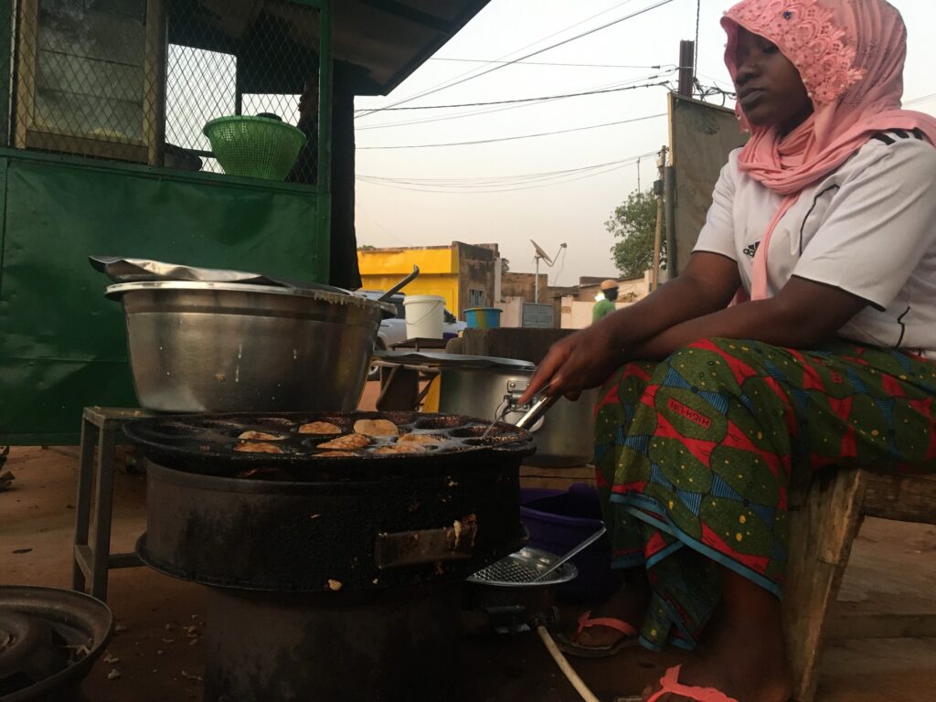 Quartier Zogona. Il est 17 h. C’est l’heure de la descente de travail. Une folle ambiance de vrombissements, de klaxons de véhicules et de cyclomoteurs règne dans une rue. Un étal en métal de couleur bleue trône sous l’ombre d’un arbre au bord de la rue. Trois jeunes filles y animent un petit commerce. Elles y vendent des galettes à base de petit mil. Des clients marquent des arrêts, se font servir et continuent leur chemin. Les galettes sortent de l’huile bouillante dans les casseroles aux sachets pour la plupart des clients.