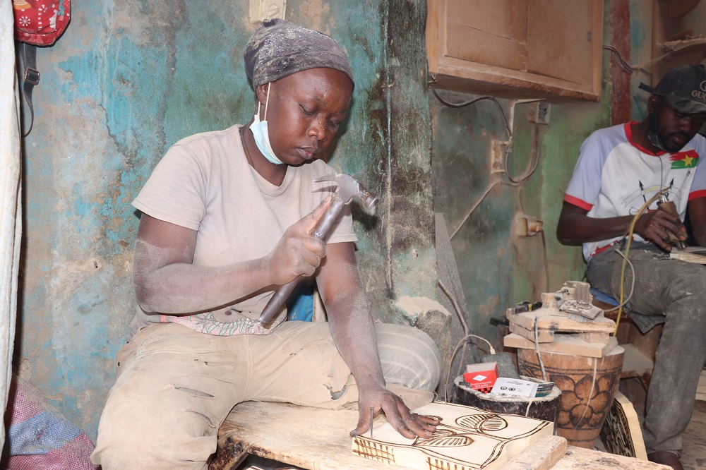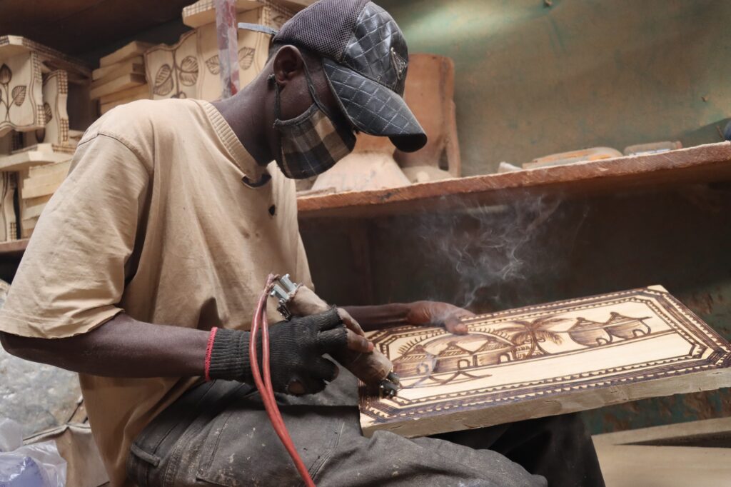 Selon Elie, les arts plastiques sont un héritage familial. Depuis tout petit, il a baigné dans cet environnement même si aujourd’hui il ne fait plus exactement la même chose. Alors à son tour, il tend la perche à d’autres jeunes. Parmi ses 12 employés, Placide Wendemi Bancé, étudiant en année de licence en sciences économiques et de gestion. Avec son pyrograveur, il donne vie à une planche.