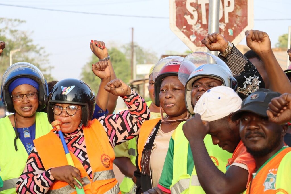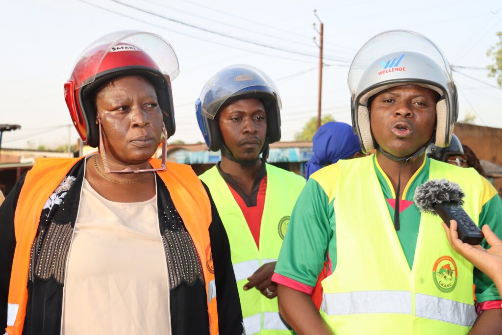 Carrefour du collège Sainte-Thérèse de Banfora. Il est un peu plus de 16 heures et la circulation s’anime de tous les côtés. Au bord de la route, un groupe d’hommes et de femmes en gilets jaune et orange échange les dernières consignes avant une activité de sensibilisation. Puis Salamata Zon s’avance, haut-parleur en main. Dès que le feu passe au rouge, elle interpelle les usagers en dioula sur le port du casque et la sécurité routière.