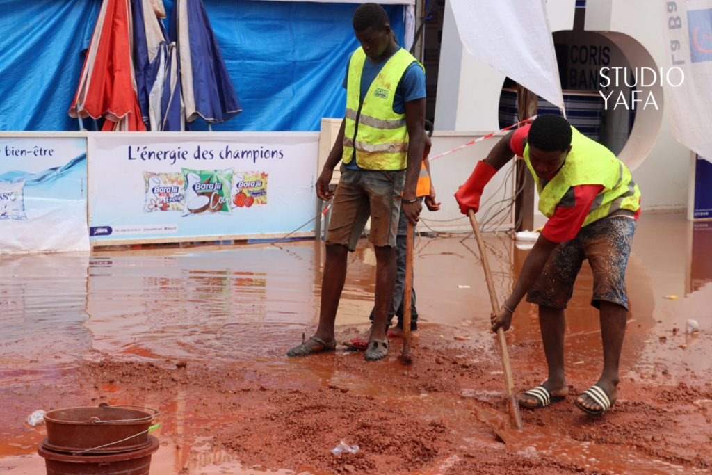 Des cartons mouillés, des sacs éventrés, sortis des stands et déposés dans la boue rouge. Des commerçants, le visage fermé, constatent les dégâts avec impuissance. À quelques mètres, de jeunes exposants fulminent de colère, pendant que des sapeurs-pompiers s’organisent pour évacuer l’eau. Mais en attendant leur intervention, certains exposants, avec des moyens de fortune, tentent de creuser des passages pour faire couler l’eau. Ainsi est l’atmosphère qui règne, ce matin, sur une partie de la foire de la Semaine nationale de la culture (SNC).