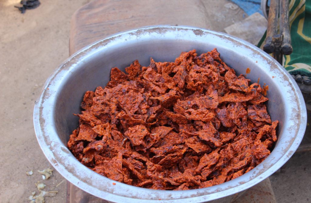 La production du kilichi se fait chaque jour dans cet atelier. Chaque matin, de la viande, de bœufs ou parfois de moutons ou de chèvres désossée y est transportée. Celle-ci est découpée sous forme d’escalope. « Quand nous avons fini par nous débarrasser des os, nous coupons la viande en fines lamelles », explique Abdoulaye. Après l’avoir découpé les feuilles de viande sont étalées au soleil pour être séchées.