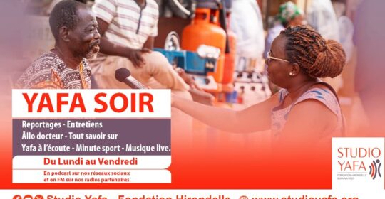 Des reportages, des entretiens, du sport, de la musique, des éclairages sur des thématiques variées. Chaque jour, du lundi au vendredi sur l’ensemble des radios partenaires, les équipes de Yafa fournissent un programme dense d’information en 10 minutes. Yafa Soir est diffusé en 5 langues : Français, Mooré, Fulfuldé, Gulmancéma, Dioula.