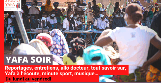 Des reportages, des entretiens, du sport, de la musique, des éclairages sur des thématiques variées. Chaque jour, du lundi au vendredi sur l’ensemble des radios partenaires, les équipes de Yafa fournissent un programme dense d’information en 10 minutes. Yafa Soir est diffusé en 5 langues : Français, Mooré, Fulfuldé, Gulmancéma, Dioula.